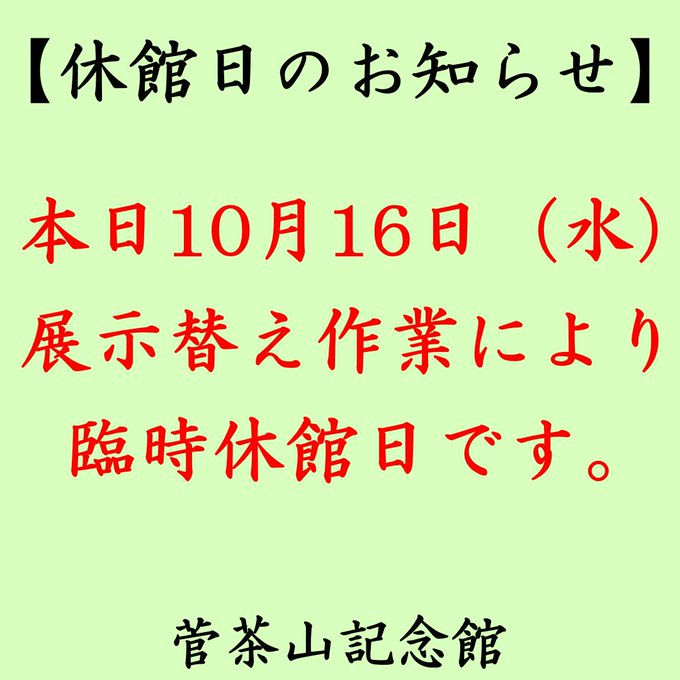 【休館日のお知らせ】 本日10月16日(水)は展示替え作業により臨時休館日となっております。 ご来館をご予定の方はお気を付けくださいませ。 #菅茶山記念館 #福山市 #神辺町 #休館日 #展示替え