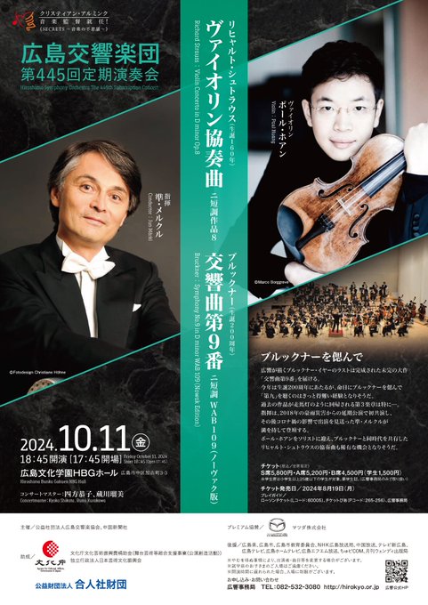 明日10/11(金)は#第445回定期演奏会を開催。#準・メルクル指揮、#ポール・ホアンを迎えてR.シュトラウスのVn協奏曲。後半はブルックナーの命日に聴く交響曲第9番。当日券は17:30より会場窓口..