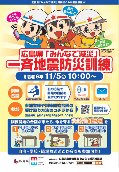 【広島県民は参加せにゃあいけんじゃろ】11/5(火)10時広島県民みんなで一緒に地震訓練に参加しませんか昨年度は広島県民約53万人が参加しました!その場で参加できるので、ご家庭でも職場でも、どなたでも..