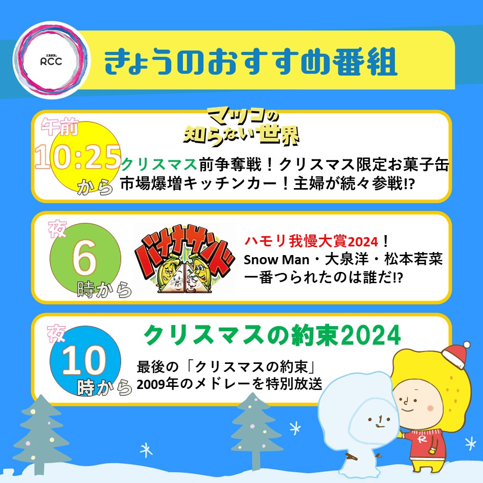 12/24(火)今日のおすすめ番組午前10時25分#マツコの知らない世界お菓子缶&キッチンカーの世界夜6時#バナナサンドハモリ我慢大賞2024!夜8時55分#マツコの知らない世界からあげ&もふもふ犬サ..