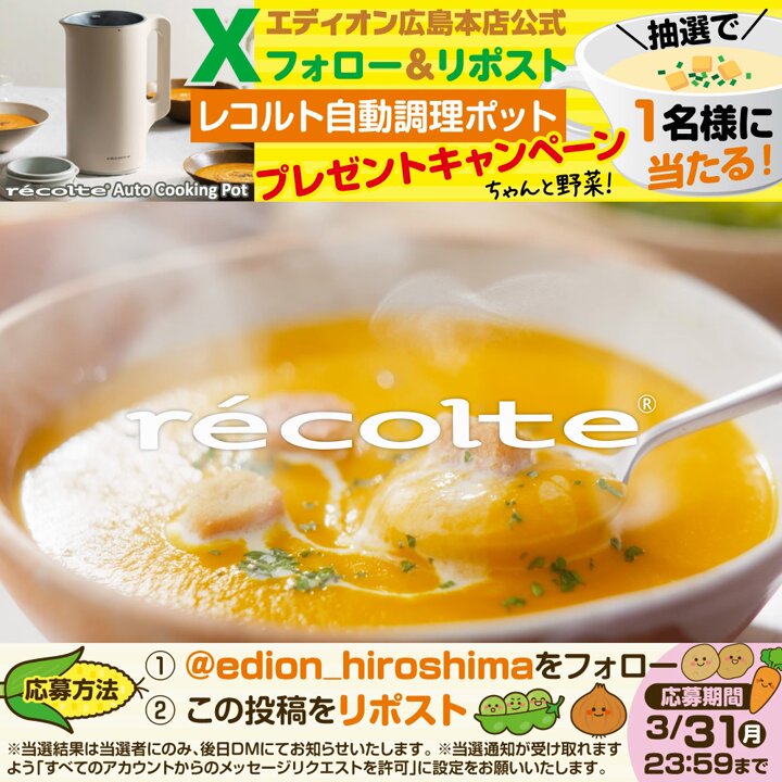 フォロー&リポストプレゼントキャンペーン“ほったらかし”でお料理完成スリムで便利な#レコルト自動調理ポットを抽選で【1名様】にプレゼント応募方法@edion_hiroshimaをフォローこの投..