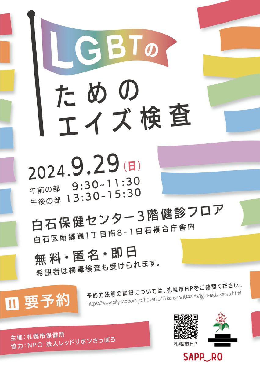 【保健福祉局】9/29(日)、白石保健センター3階健診フロアでMSM(男性と性交渉をする男性)を中心としたLGBTの方を対象に、無料・匿名・即日のエイズ検査を行います。梅毒検査も受検可能です。申し込み..