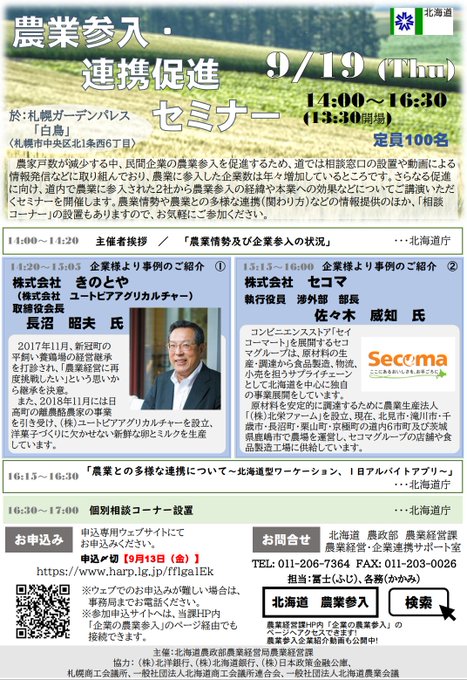 /企業の皆様へ農業参入・連携促進セミナー\9/19(木)にホテル札幌ガーデンパレスで、企業による農業参入の魅力を紹介するセミナーを開催道内で農業に参入した(株)#きのとや、(株)#セコマが、参入の経緯..