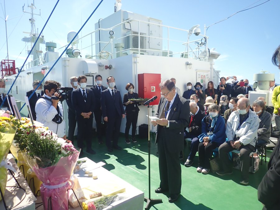 【#洋上慰霊を開始】#北方領土への墓参の実施が見通せない間、元島民の方々の「せめて四島の近くで」との思いに応えるため、8/20から9/21にかけて全7回、船の上から慰霊を実施。第1回目の本日8/20は..