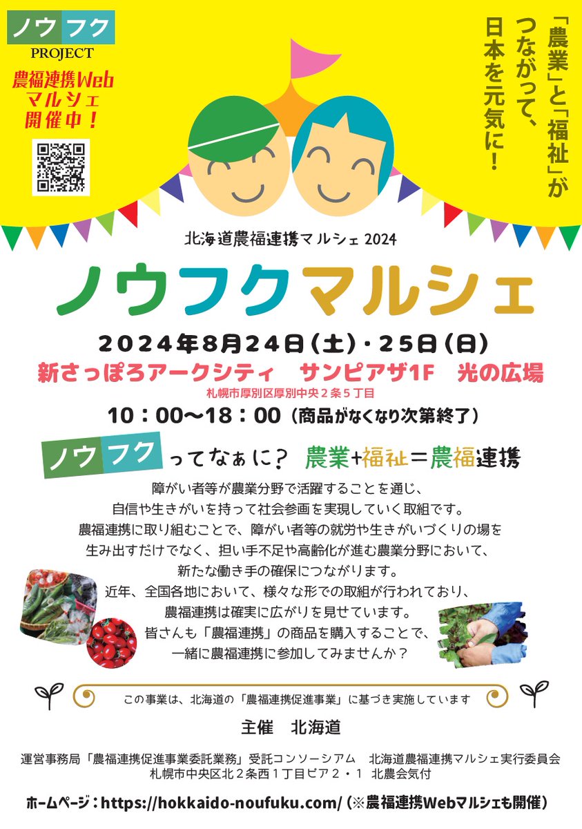 /#農業+#福祉北海道ノウフクマルシェ2024\8/24(土)~25(日)に新さっぽろサンピアザで#ノウフクマルシェを開催障がい福祉サービス事業所で生産・加工した野菜やパン、焼き菓子、雑貨などを販売心..
