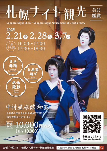 【札幌ナイト観光芸妓鑑賞】実施日:2月21日(金)、28日(金)、3月7日(金)実施時間:1回目16:00~、2回目17:30~開演芸妓さんの舞踊鑑賞、お座敷遊び、芸妓さんと一緒に記念撮影ができるプラ..