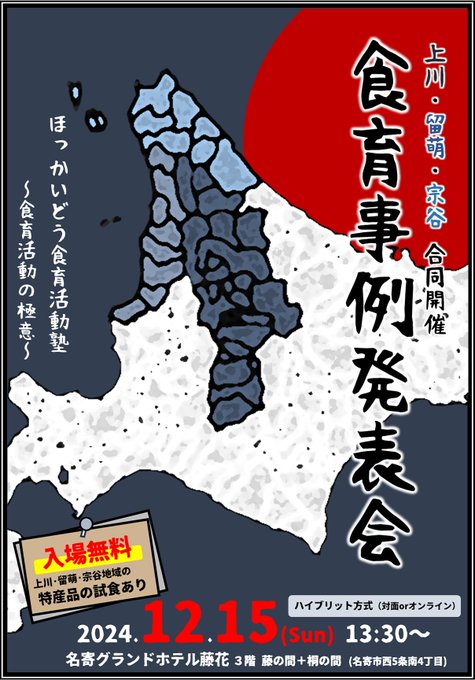 /プロから学ぶ#食育\12/15(日)に#名寄市で食育事例発表会を開催#上川#留萌#宗谷の各地域で食育活動を行う食育のプロが、経験談や極意などをご紹介オンライン参加も可能食育に取り組む方、関心のある方..