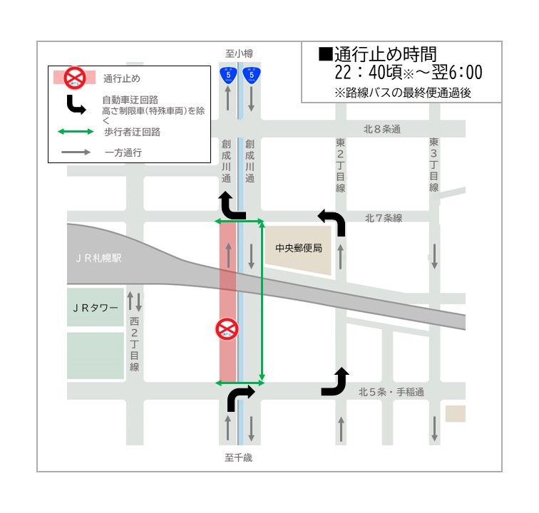 【まちづくり政策局】北海道新幹線の工事に伴い、11/28(木)・29(金)に、国道5号北向き車線の北5条・手稲通~北7条線間において、夜間全面通行止めの交通規制が行われます。近くを通行する際は、迂回へ..