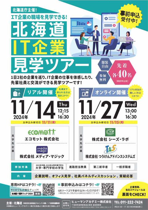 /#IT企業を体感しよう\道内IT企業を訪問する職場見学ツアーを開催今回は札幌市内の4社が参加オフィス見学、実際に働いている社員とお話しができますリアル開催(11/14)、オンライン開催(11/27)..