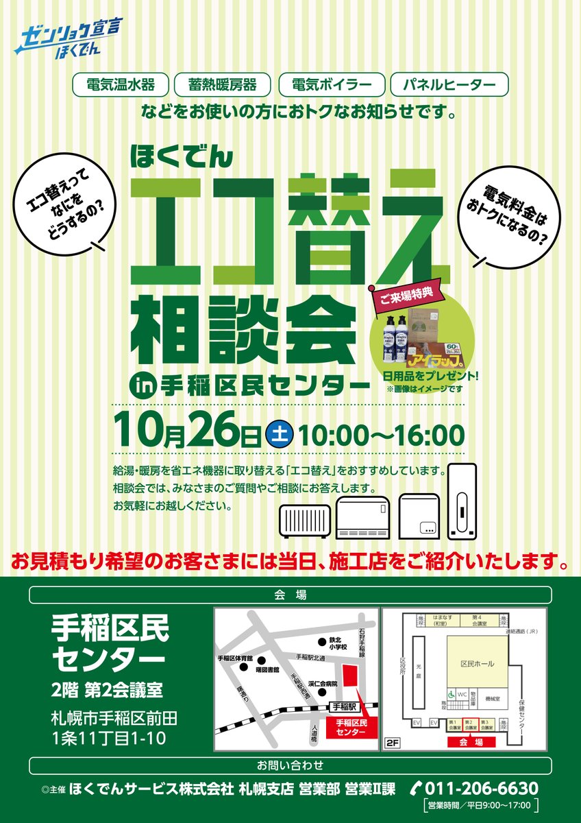 【札幌市でオール電化住宅にお住まいのお客さまへ】10月26日(土)に、手稲区民センターにてエコ替え相談会を開催!給湯・暖房を省エネ機器に取り替える『エコ替え』について、ご質問やご相談にお答えします。▼..