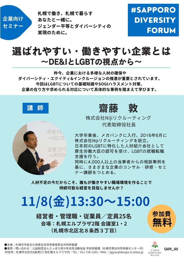 【市民文化局】11/8(金)13時30分~、#SAPPORODIVERSITYFORUM「選ばれやすい・働きやすい企業とは~DE&IとLGBTの視点から~」を札幌エルプラザで開催!企業の在り方..