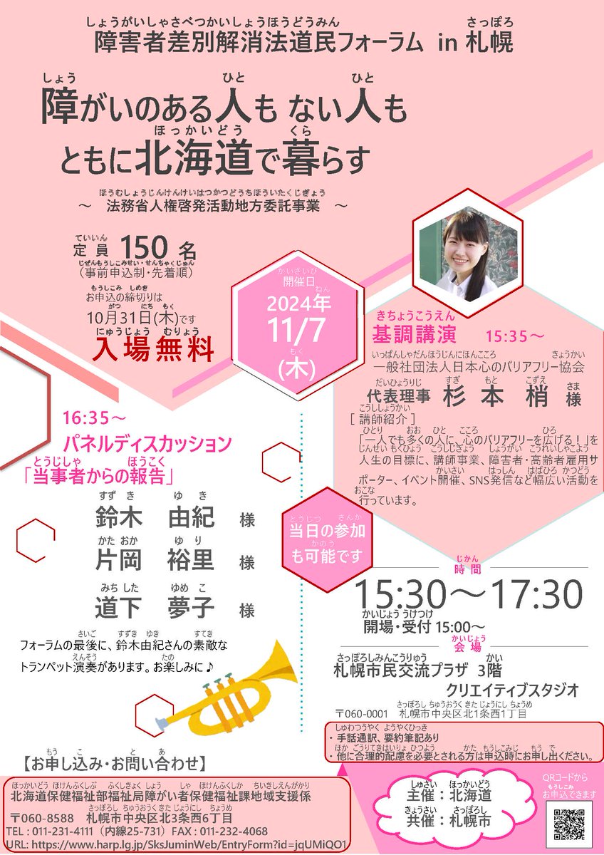 【保健福祉局】11/7(木)に札幌市民交流プラザで開催する「障害者差別解消法道民フォーラムin札幌」の参加者募集!「障がいのある人もない人もともに北海道で暮らす」と題し、基調講演やパネルディスカッショ..