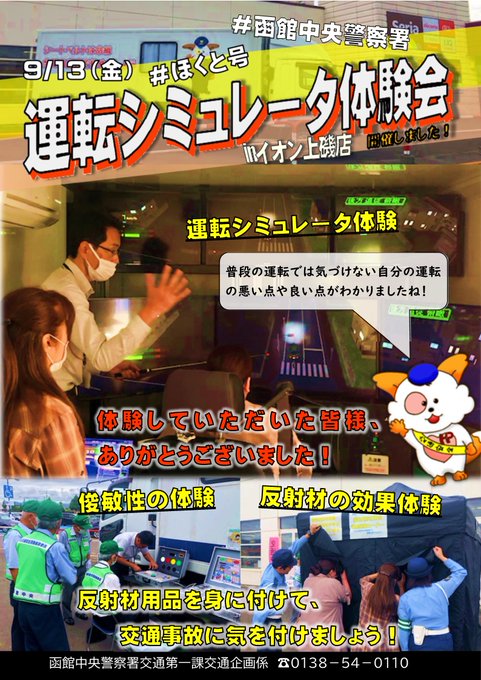 【#函館中央警察署#運転シミュレータ体験会を開催しました】#9月13日#イオン上磯店で#運転シミュレータ体験会を開催しましたたくさんのご参加ありがとうございました夕暮れも早くなってきましたね。夜間外出..