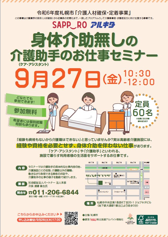 【保健福祉局】9/27(金)、介護職への就労を目指す方、関心のある方等を対象に、「身体介助無しの介護助手のお仕事セミナー」を開催。介護助手の仕事内容や介護施設ごとの役割などについて紹介します。9/26..