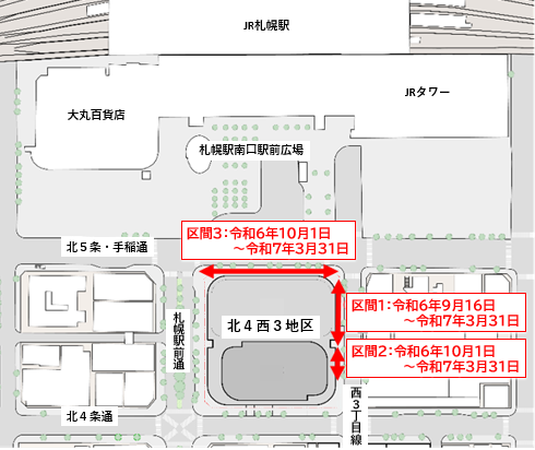 【まちづくり政策局】札幌駅南口北4西3地区の再開発工事に伴い、9/16(月)から令和7年3月末まで、西3丁目線沿いの歩道が一部通行止めとなります。近くを通行の際はご注意ください。※10/1(火)から、..