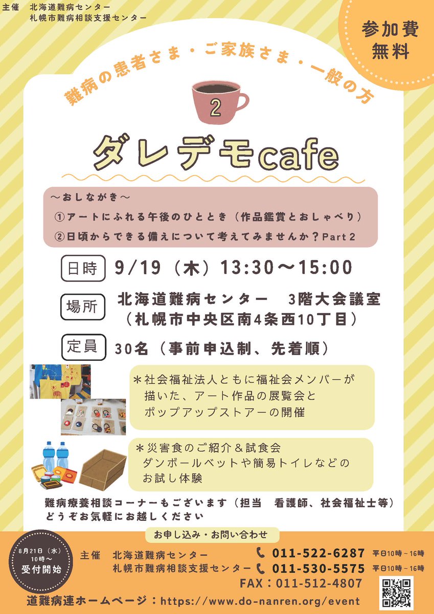 【保健福祉局】9/19(木)13時30分から、北海道難病センターで「ダレデモcafe」を開催。アート作品の鑑賞や災害食のご紹介&試食会等を行います。難病の患者さま・ご家族さまだけではなく、一般の方も参..