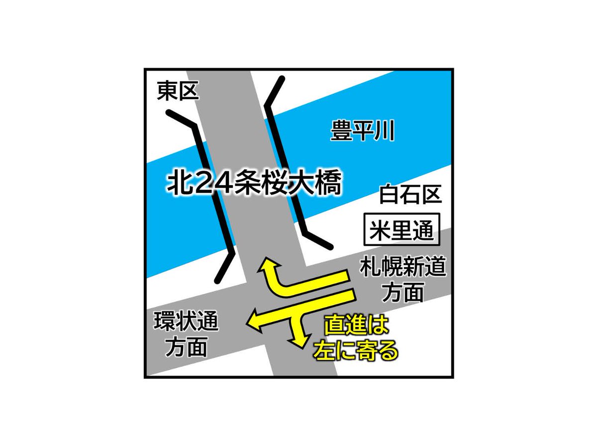 【建設局】 8/29(木)から、米里通と北24条通の交差点において、米里通(環状通方面)の右車線は、「右折専用」に変わります。米里通(環状通方面)を直進する場合は、左側の車線を通行してください。