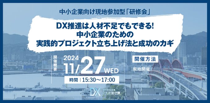 \人材不足でもできるDX推進 #研修会/ 現地参加型(講義+#ワークショップ) 参加者募集 11/27(水)15:30- 神戸国際会館 中小企業向け実践的プロジェクト DX推進に必要な「マインドセット」形成の極意 成果が出せるDX推進チームのつくり方 https://kobe-dxotasuketai.jp/seminar/page21.php… #無料 #DX #神戸 #DXお助け隊
