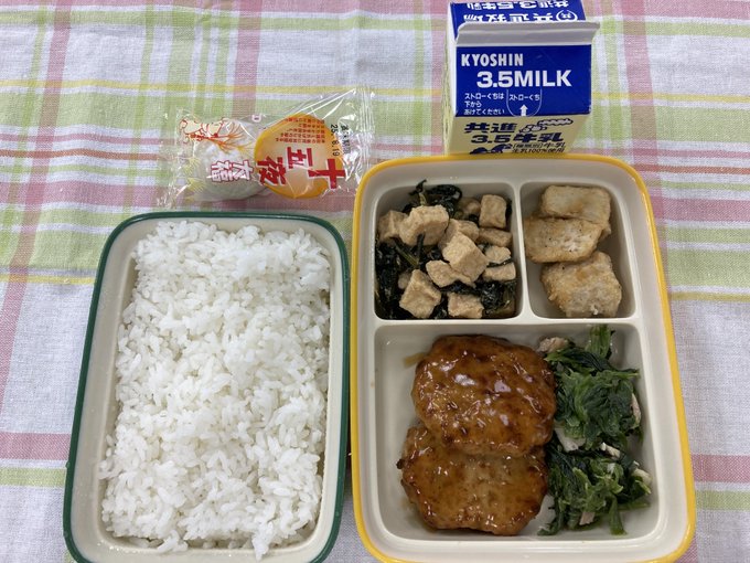9月17日(火)の神戸市中学校給食の献立(ランチボックス)平つくねの照り焼きほうれん草とベーコンのソテー厚揚げと小松菜のみそ煮里いものから揚げ十五夜もち給食の献立等の産地情報はhttps://kobe..