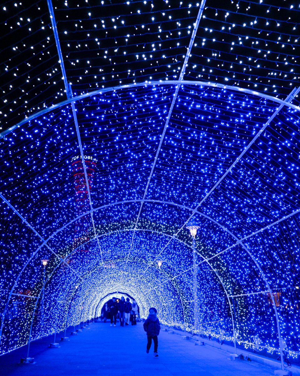 メリケンパークのアーチイルミネーションきらめく星空の下、幻想的なアーチを抜けるとBEKOBEと夜景が広がります#今日もお疲れ様でした