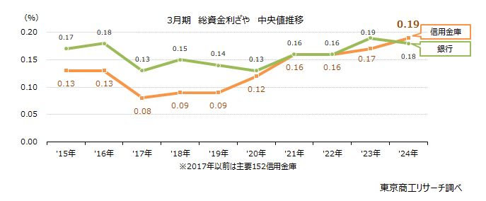 全国253信用金庫の2024年3月期決算の「総資金利ざや(中央値)」は0.19%(前年0.17%)で、2018年3月期以降で最高を記録した。銀行は0.18%で、2020年同期以来、4年ぶりに銀行を抜い..