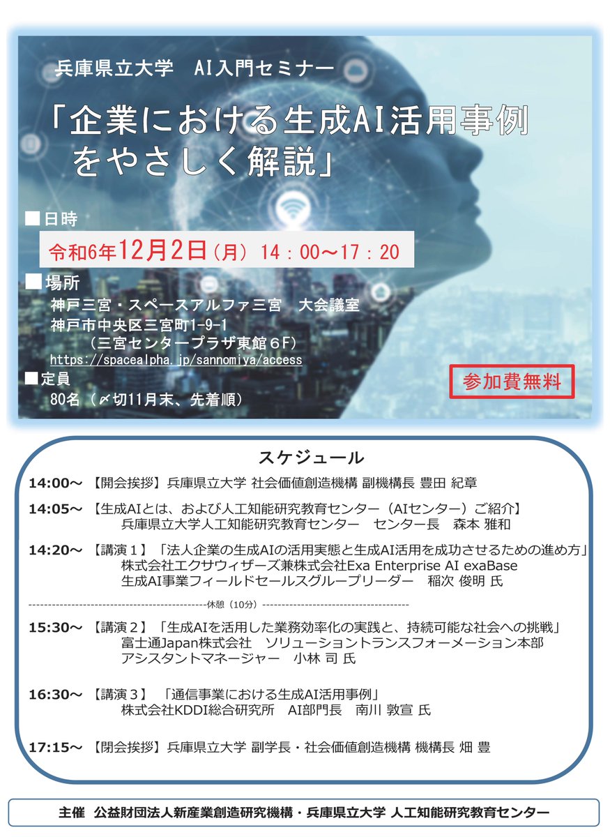兵庫県立大学AI入門セミナー「企業における生成AI活用事例をやさしく解説」2024年12月2日(月)14:00~17:20場所:スペースアルファ三宮大会議室参加費無料定員:80名(先着順)申込締切:1..