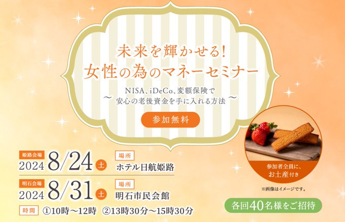 【お知らせ】あす8月31日(土)に明石市民会館で実施予定の「未来を輝かせる!女性の為のマネーセミナー」につきまして、台風10号による公共交通機関への影響および、ご参加予定の皆さまの安全などを考慮した結..