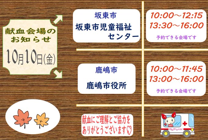 明日の献血バスは、#坂東市 #鹿嶋市 に向かいます。多くの方のご協力をお待ちしております 10月キャンペーン情報はこちら https://bs.jrc.or.jp/ktks/ibaraki/2025/09/10-1.html… 【令和8年1月5日(月)から】献血カード・献血手帳の新規発行および更新の終了について →https://jrc.or.jp/donation/blood/news/2024/1202_044032.html…