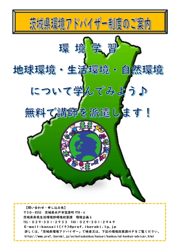 【茨城県環境アドバイザー制度のご案内】無料で専門講師を派遣します環境に関する幅広い分野から講師が選べ、子どもから大人まで学ぶことができます毎年多くの学校や図書館等で実施。ぜひご相談ください。詳しくはこ..