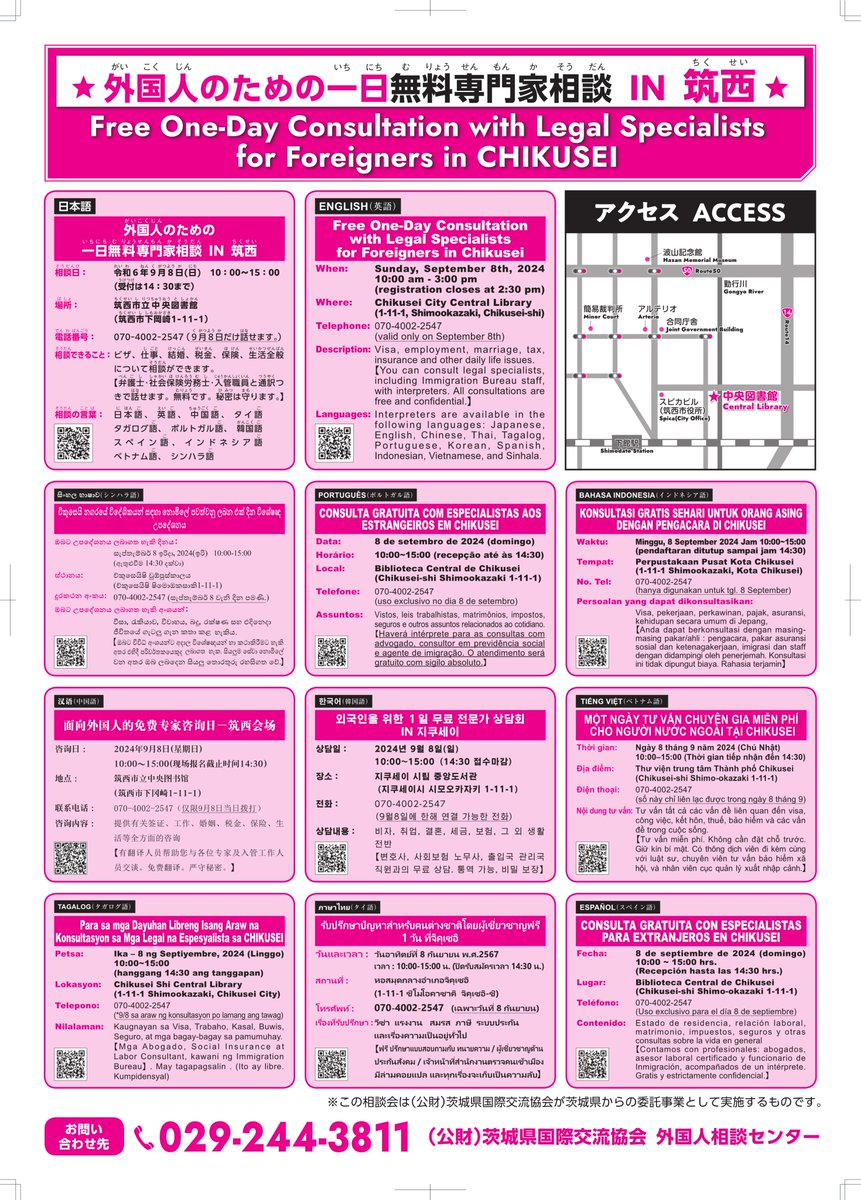 /外国人のための一日無料専門家相談会in筑西\9/8(日)10:00~15:00、筑西市立中央図書館で各種専門家に相談できます。無料・対面・秘密厳守・通訳付き・予約不要。事前問合せは、外国人相談センタ..