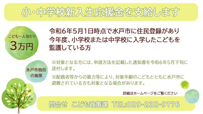 「小・中学校新入生応援金」を支給します小・中学校新1年生となる年齢のこどもを監護する世帯に対して、応援金を支給します▼給付額/こども1人あたり3万円※対象となる方には、申請方法などを記載した通知書を5..