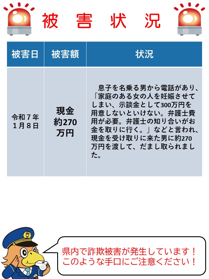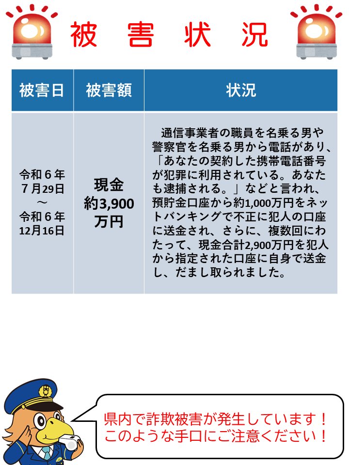 【オレオレ詐欺被害が発生!】詳細は添付ファイルを確認してください!○電話でのお金の話は詐欺!○警察官をかたる電話は安易に対応せず、お近くの警察署や、相談ダイヤル#9110に相談!○一人で判断せず、必ず..