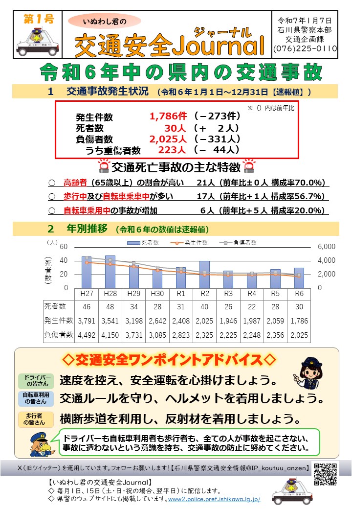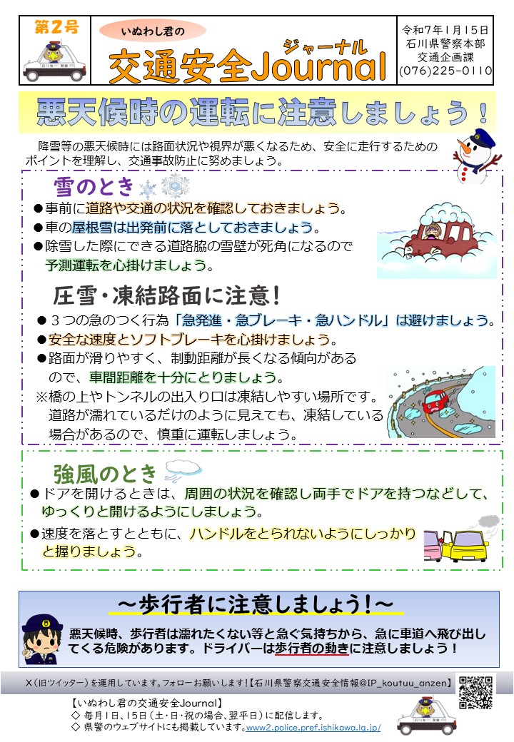 【交通安全情報】1月7日付け「いぬわし君の交通安全Journal」を掲載します。バックナンバーは、石川県警察ウェブサイト(https://www2.police.pref.ishikawa.lg.jp..