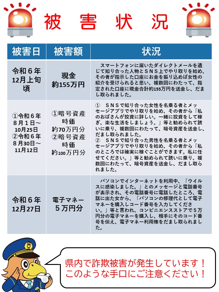 【交際あっせん詐欺・SNS型投資詐欺・サポート詐欺被害が発生!】 詳細は添付ファイルを確認してください! ○ 知らないアカウントや実際に会ったことがない相手の話は信じない ○ SNSでの投資話は詐欺を疑う! ○ 「ウイルス感染」と表示される詐欺に注意!