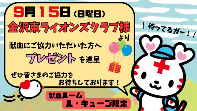 ル・キューブ限定9月15日は金沢東ライオンズクラブ様よりご協力いただいた方へプレゼントを進呈プレゼントは献血してからのお楽しみです~9月の3連休第一弾!献血お願いできませんか?ご協力をぜひお待ちしてお..