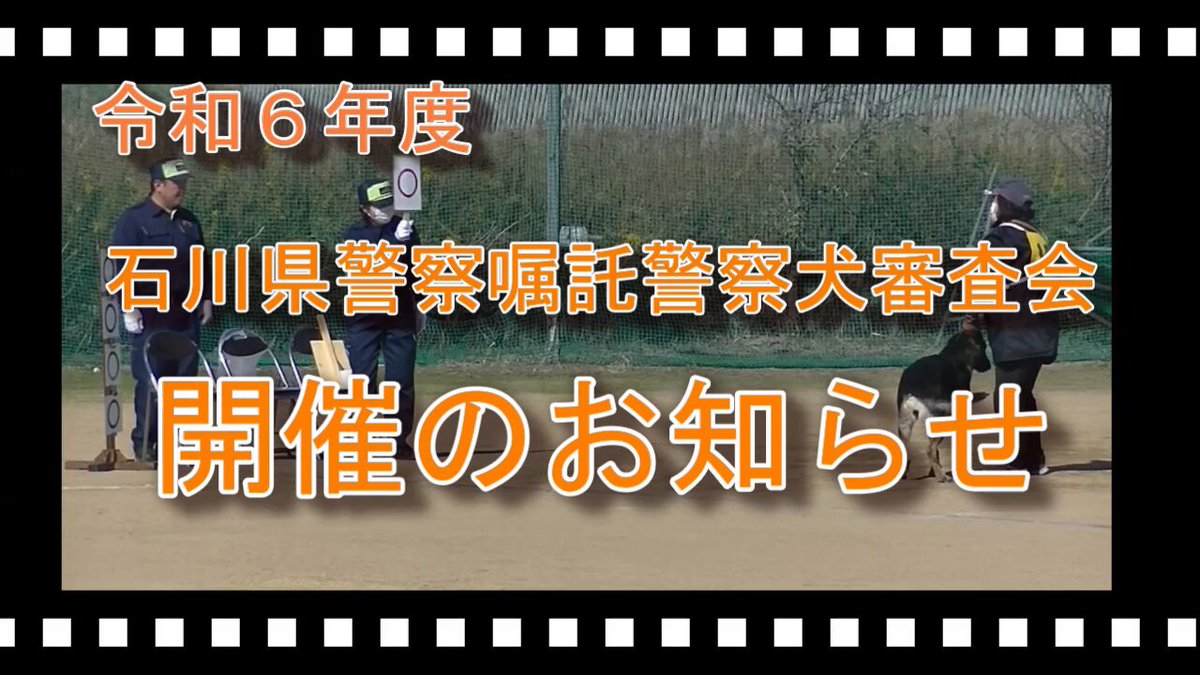 【令和6年度石川県警察嘱託警察犬審査会の開催】日時10月30日(水)午前9時30分から場所かないわ海浜広場(金沢市金石海原地内)審査科目服従、臭気選別、足跡追及、捜索の4科目申込期限9月30日(月)詳..