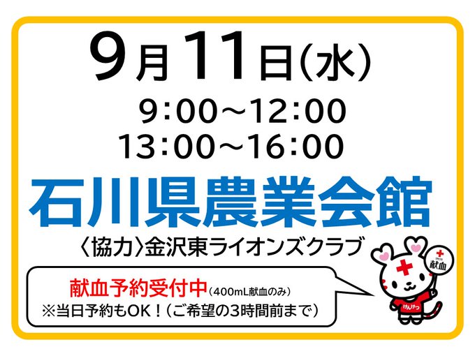 いつも献血にご協力頂きありがとうございます 11日(水)は、 #石川県農業会館(受付9:00~12:00/13:00~16:00)に 献血バスがおじゃまします 皆さまのご協力をお願いいたします! #石川 #献血