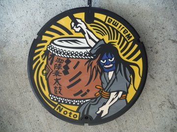 【今日は #下水道の日】 輪島市 #御陣乗太鼓 をモチーフにしたマンホール 設置前の貴重な写真です #推しマンホール蓋選手権 下水道は、まちを浸水から守るだけでなく、使って汚れた水をきれいにし、川や海を守るなど、私たちの暮らしを支えています。