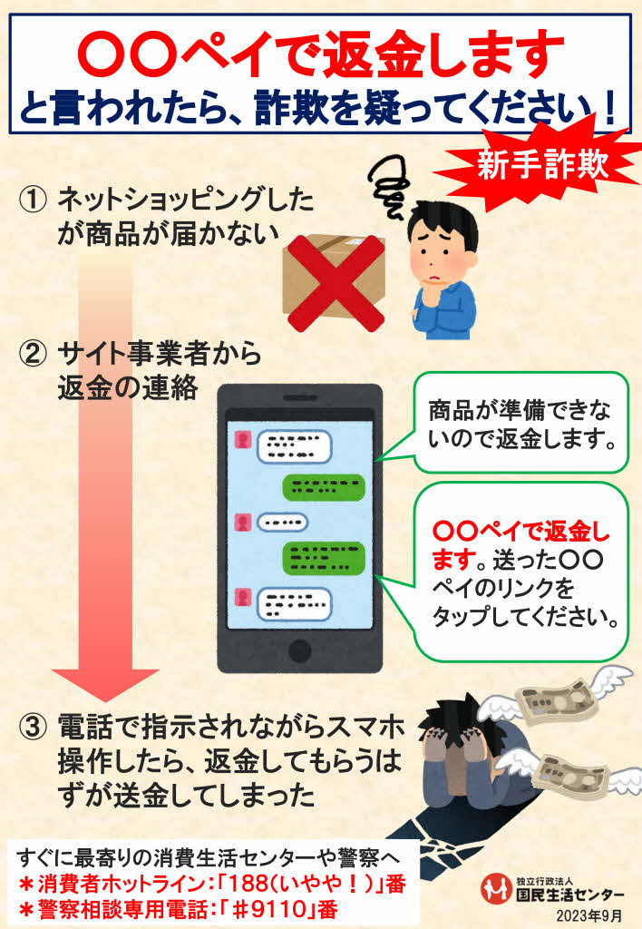 「決済アプリを使って返金する」と言われ、返金手続きを誘導されているうちに、いつの間にか「送金」してしまっていた。