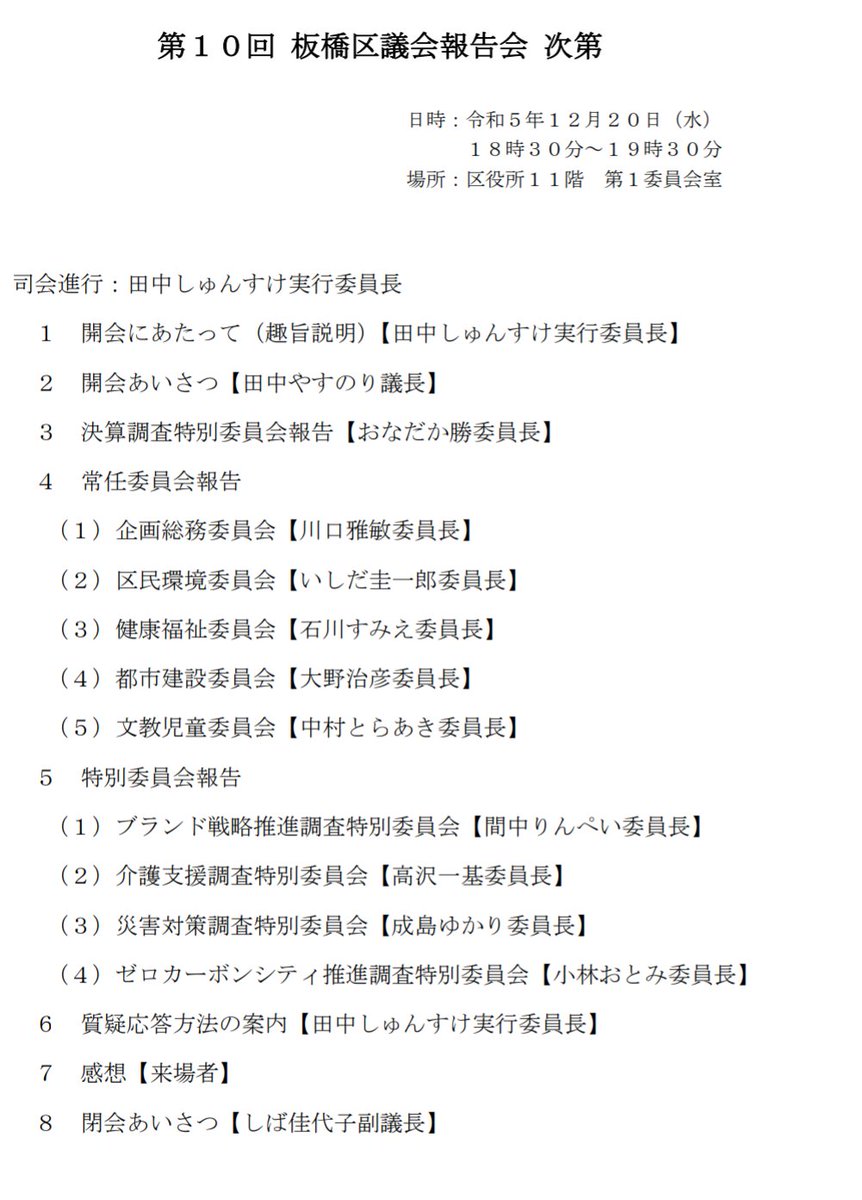 議会報告会は、区民の方々に議会活動を直接ご説明・ご報告するとともに、区民の方々のご意見・ご要望をいただくことで、議会による政策立案・提言の充実を図ることを目的としています。