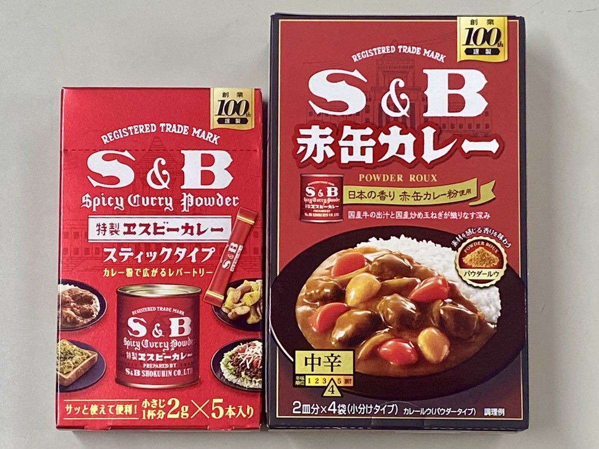 あの赤缶カレー粉を作っているエスビー食品さんが創業100年記念商品としてカレーパウダールウとスティックタイプのカレー粉を販売。