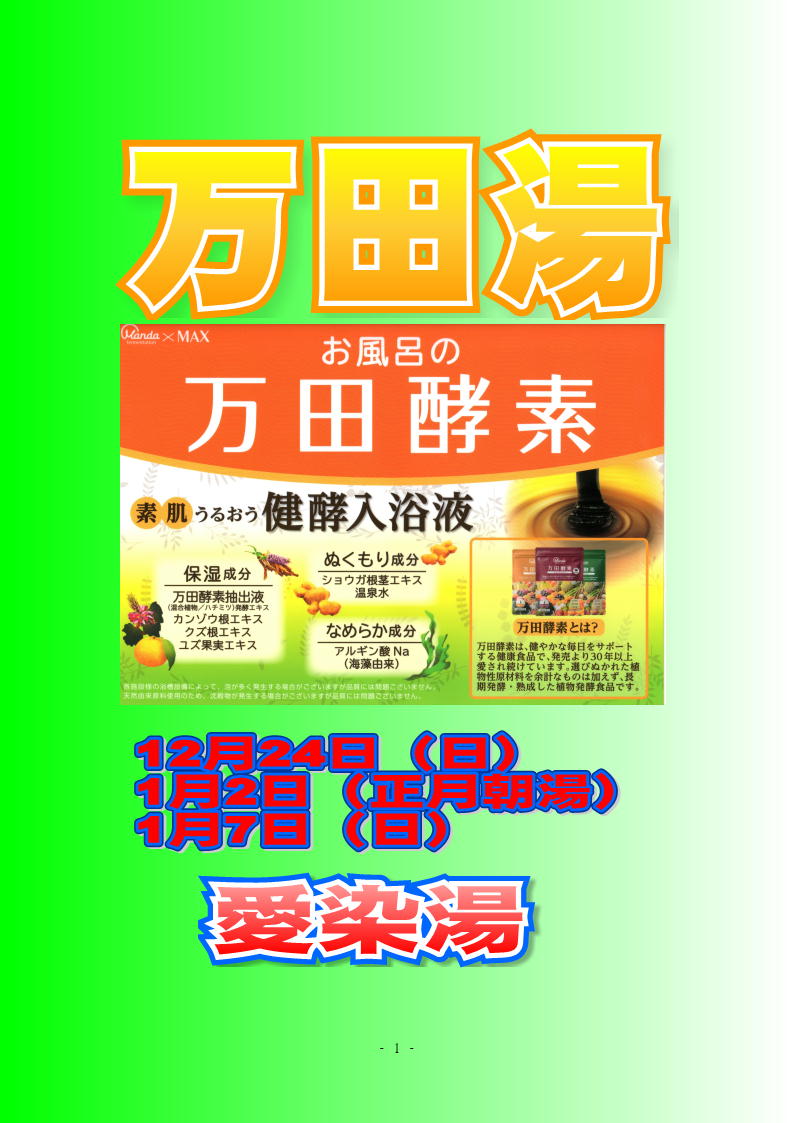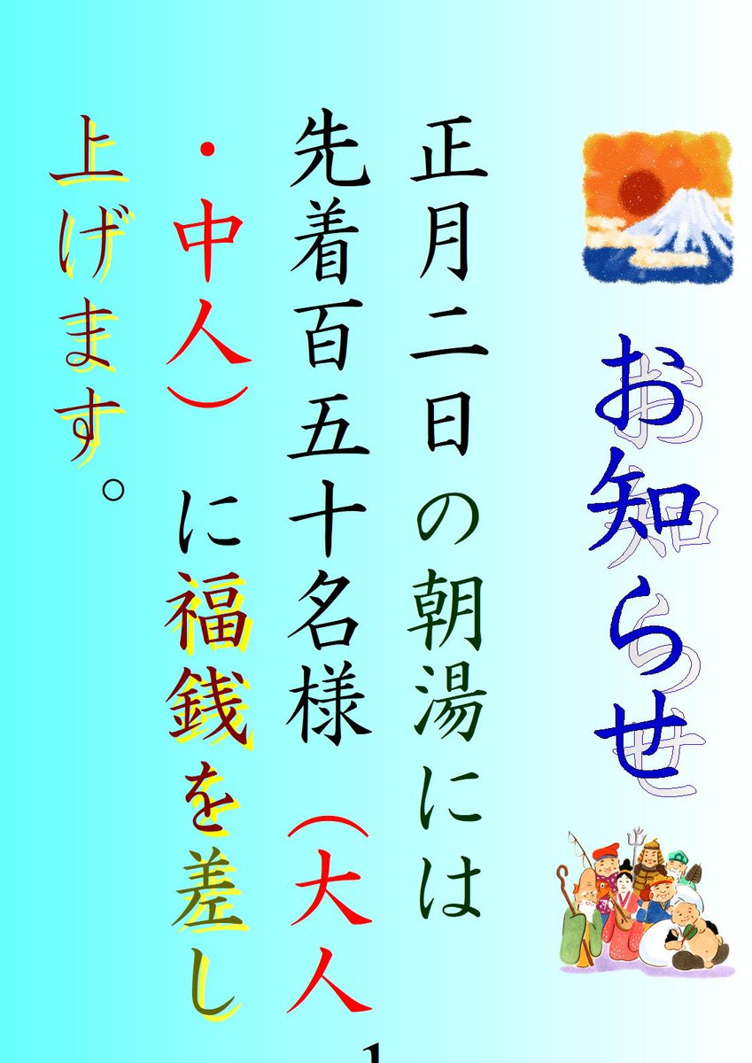 尚、正月2日の朝湯は万田湯です。先着150名樣に福銭を差し上げます。