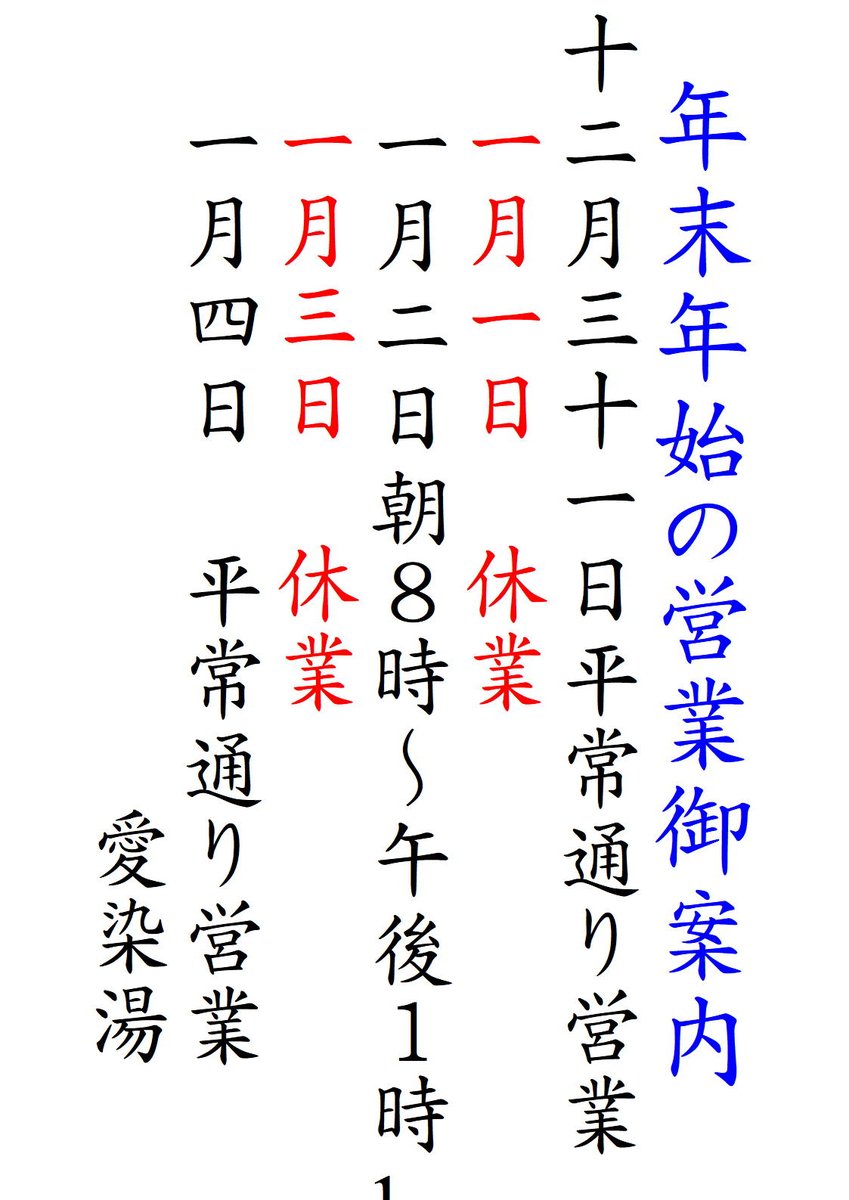 年末年始の営業案内を貼ってありますので、ご覧下さい。
