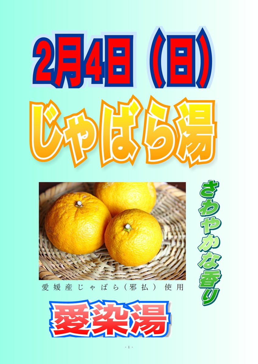 おはようございます。生憎と雨が降っていますが、午後からは晴れるようです。本日は日曜日ですので、朝8時から夜11時迄(女性は10時半)営業しています。2月4日(日)にじゃばら湯を当店では初めて行いますので、ご利用下さい😊