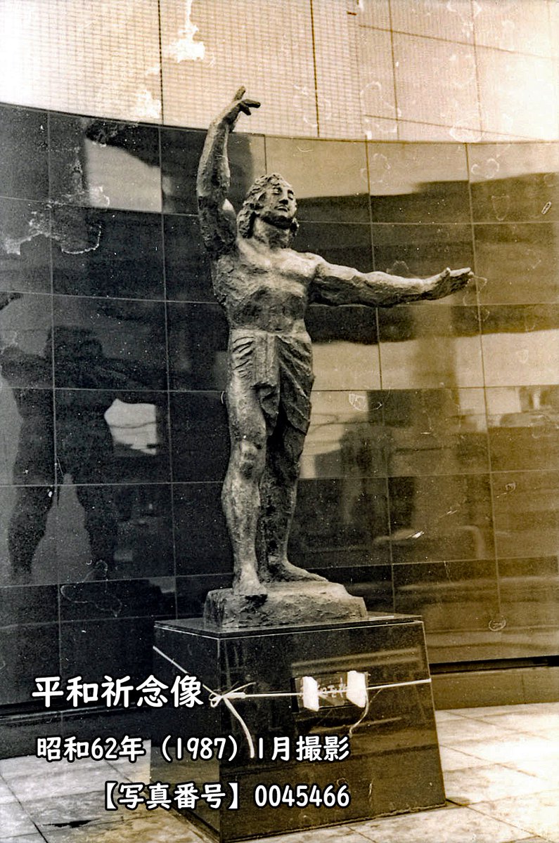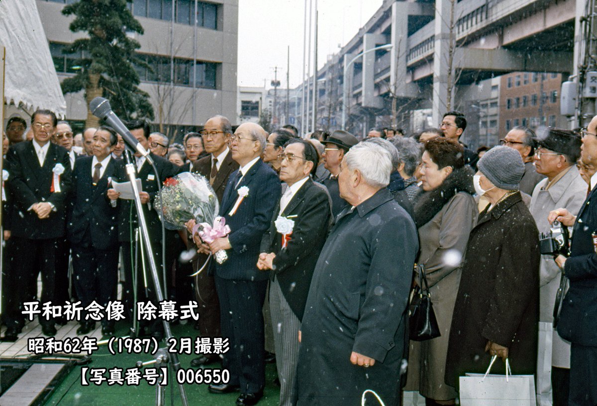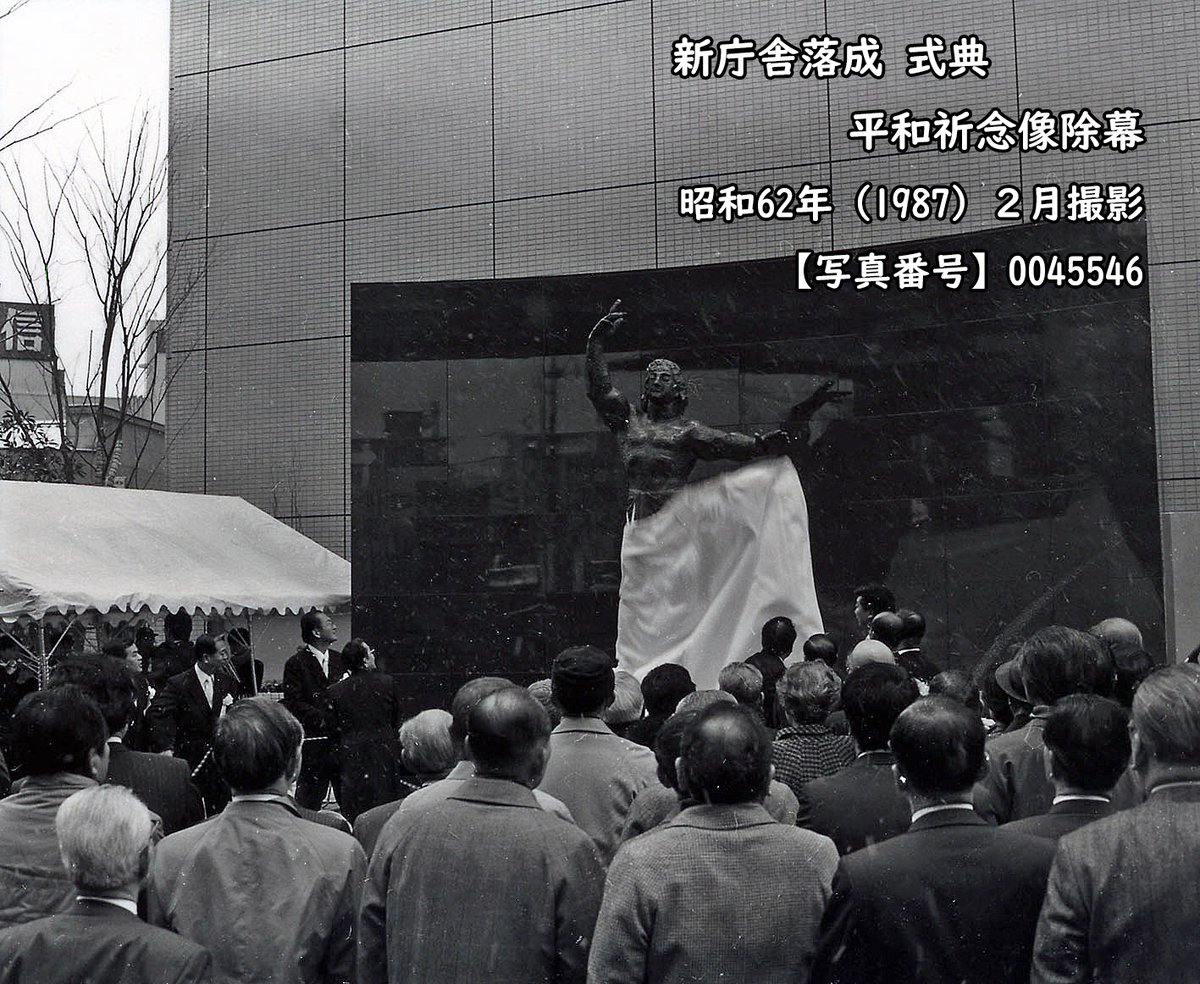旧区役所の脇に昭和62年1月新庁舎が竣工した。昭和60年1月に平和都市宣言をした区は彫刻家北村西望へ正面玄関脇に設置する平和祈念像の制作依頼をしていた。新しい像は竣工に合わせて設置された。なお「水辺」の像は現在赤塚の区立美術館へ移管され保管されている。