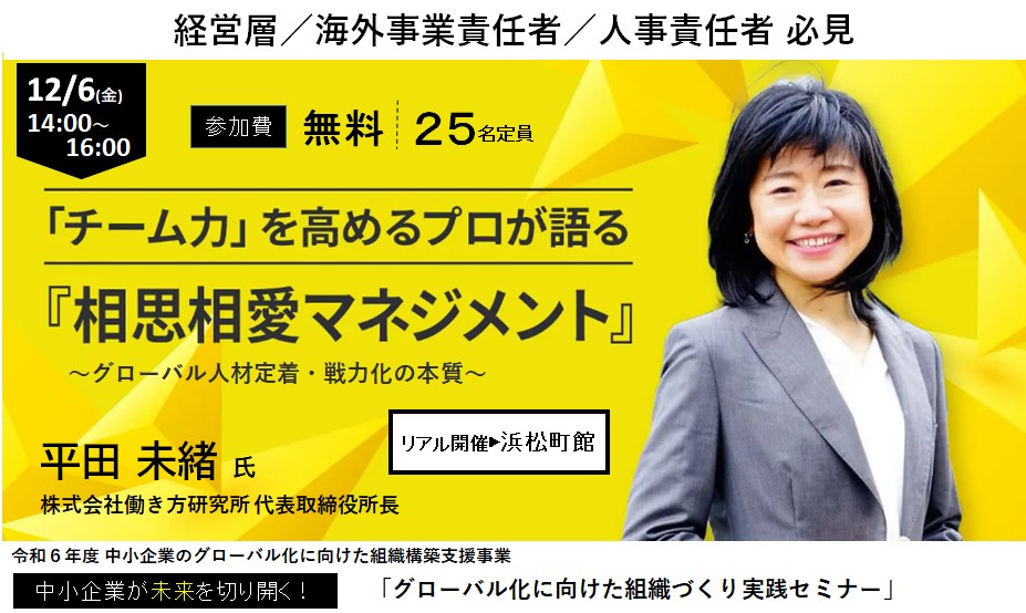 R6年度 グローバル化に向けた組織づくり 実践セミナー 12月6日(金)14:00~/無料 リアル開催 #経営層/#海外事業責任者/人事責任者 必見! 「チーム力」を高めるプロが語る『相思相愛マネジメント』~#グローバル人材定着・戦力化の本質~https://global-seminar-tokyo-kosha.jp