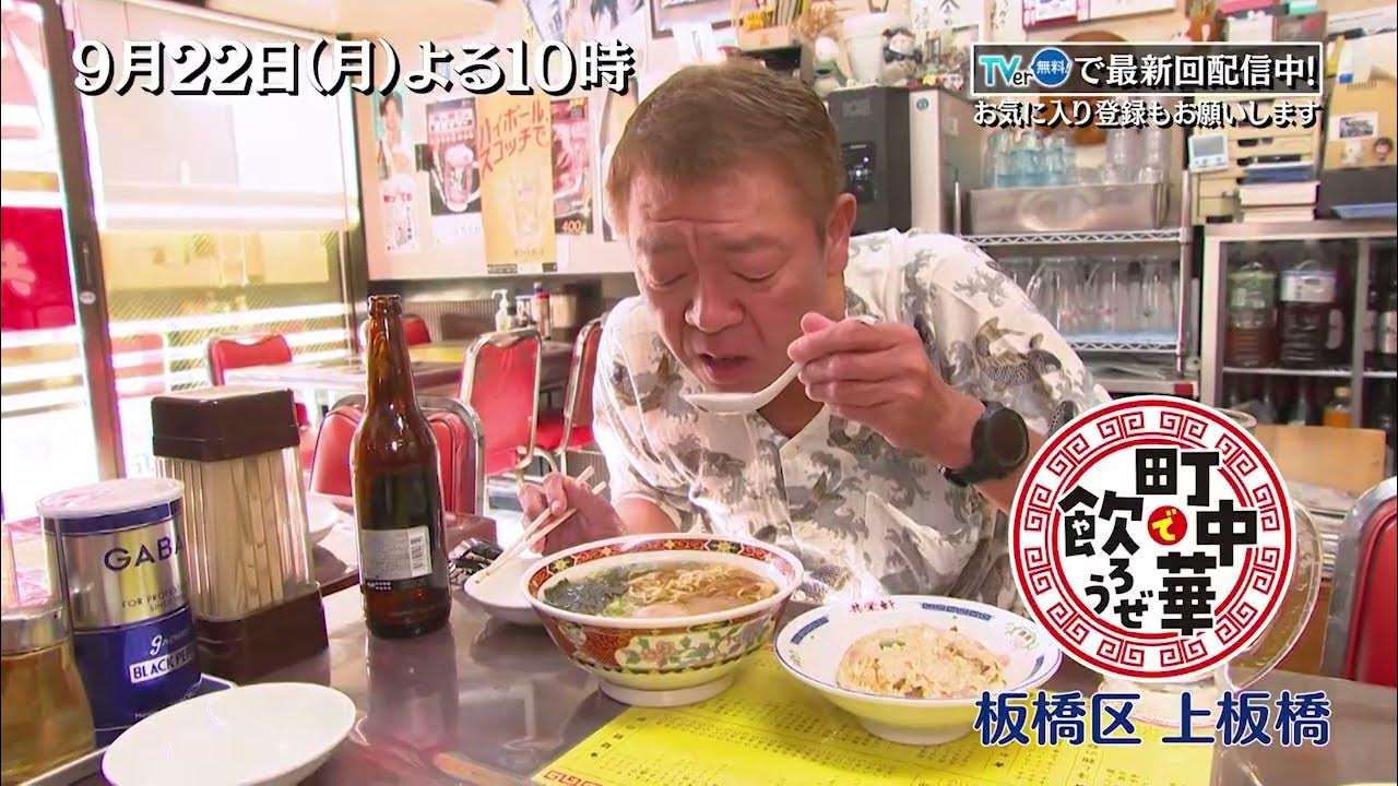 「町中華で飲ろうぜ」9/22(月)よる10時は板橋区・上板橋編!番組未開拓の地で玉ちゃんが飲っちゃいます。お目当ては、店主直々にラブコールをいただいた町中華。上板橋駅北口から徒歩10分、親子2代で切り..