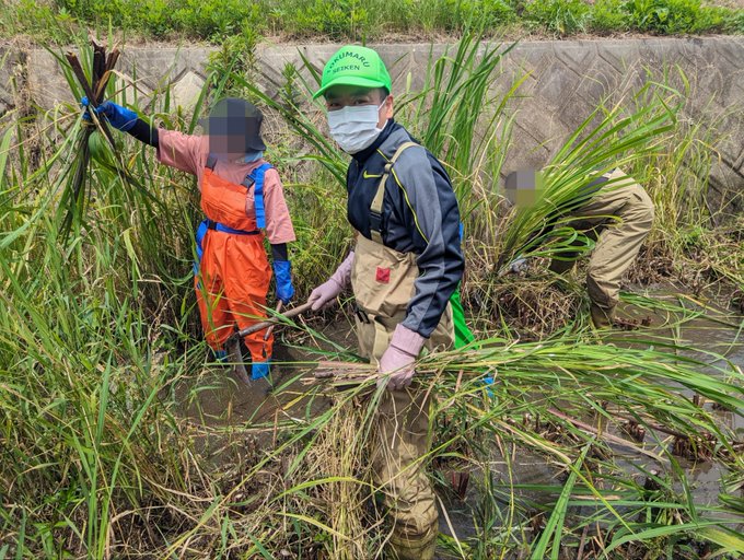 埼玉県吉見町の川で青少年健全育成徳丸地区委員会などの皆さんとマコモ刈り。昭和30年代頃まで徳丸や赤塚で使われていた七夕飾りの「マコモ馬」を徳丸の小学生が作るための準備。今年は紅梅小学校の児童が7/4(..