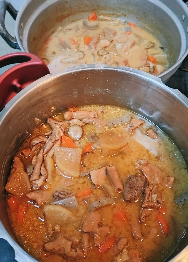 やっぱりもつ煮は、作り過ぎてしまうんだよね。今日はもつ2kg使用。鍋1個じゃ収まりきらない…5398