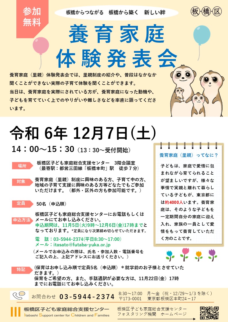 『養育家庭体験発表会』を開催します!里親制度の紹介や、普段はなかなか聞くことのできない里親による子育て体験談を聞くことができます。ぜひお気軽にご参加ください。日時:12月7日(土)14時00分~15時..